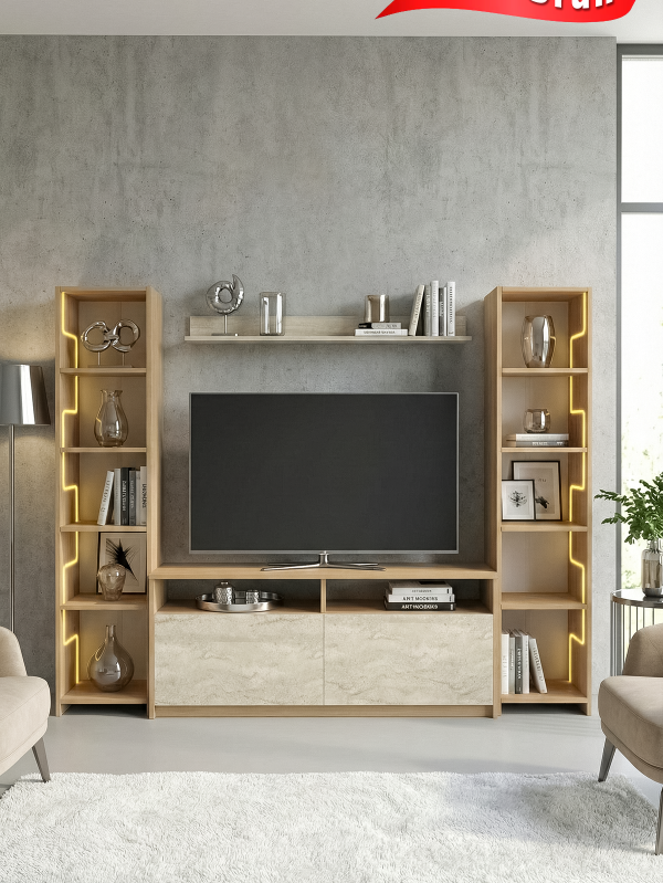 LABİRENT LEDLİ DUVAR TV ÜNİTESİ TRAVERTEN KAPAK