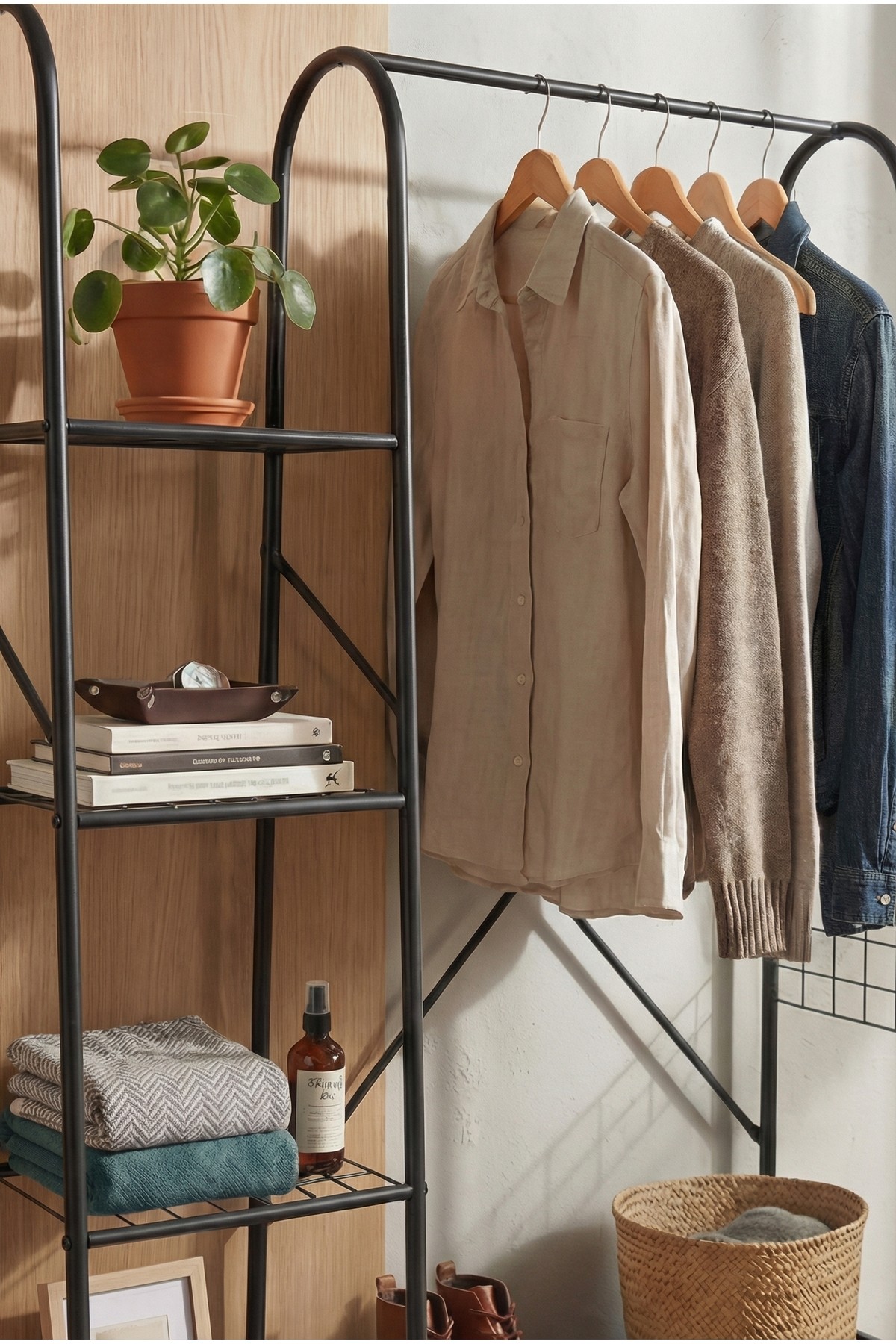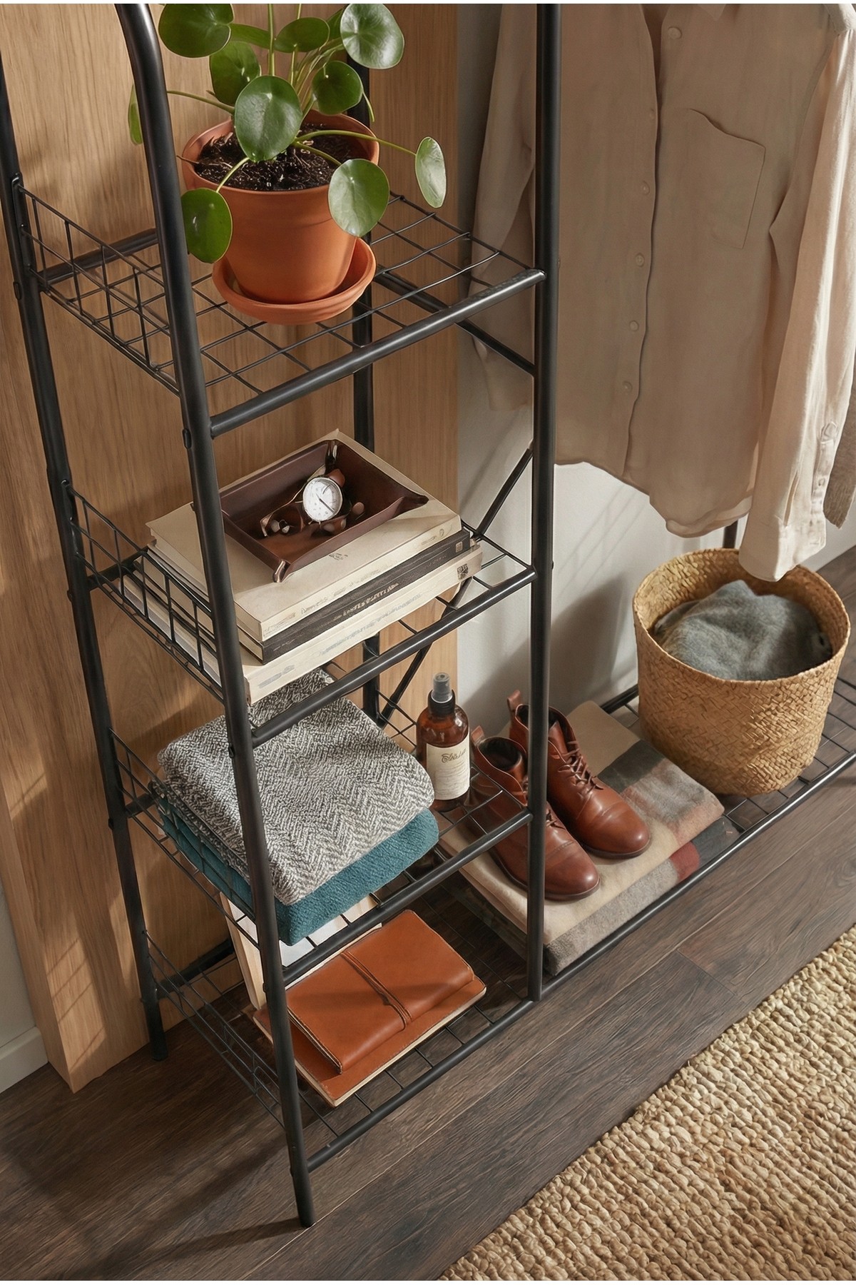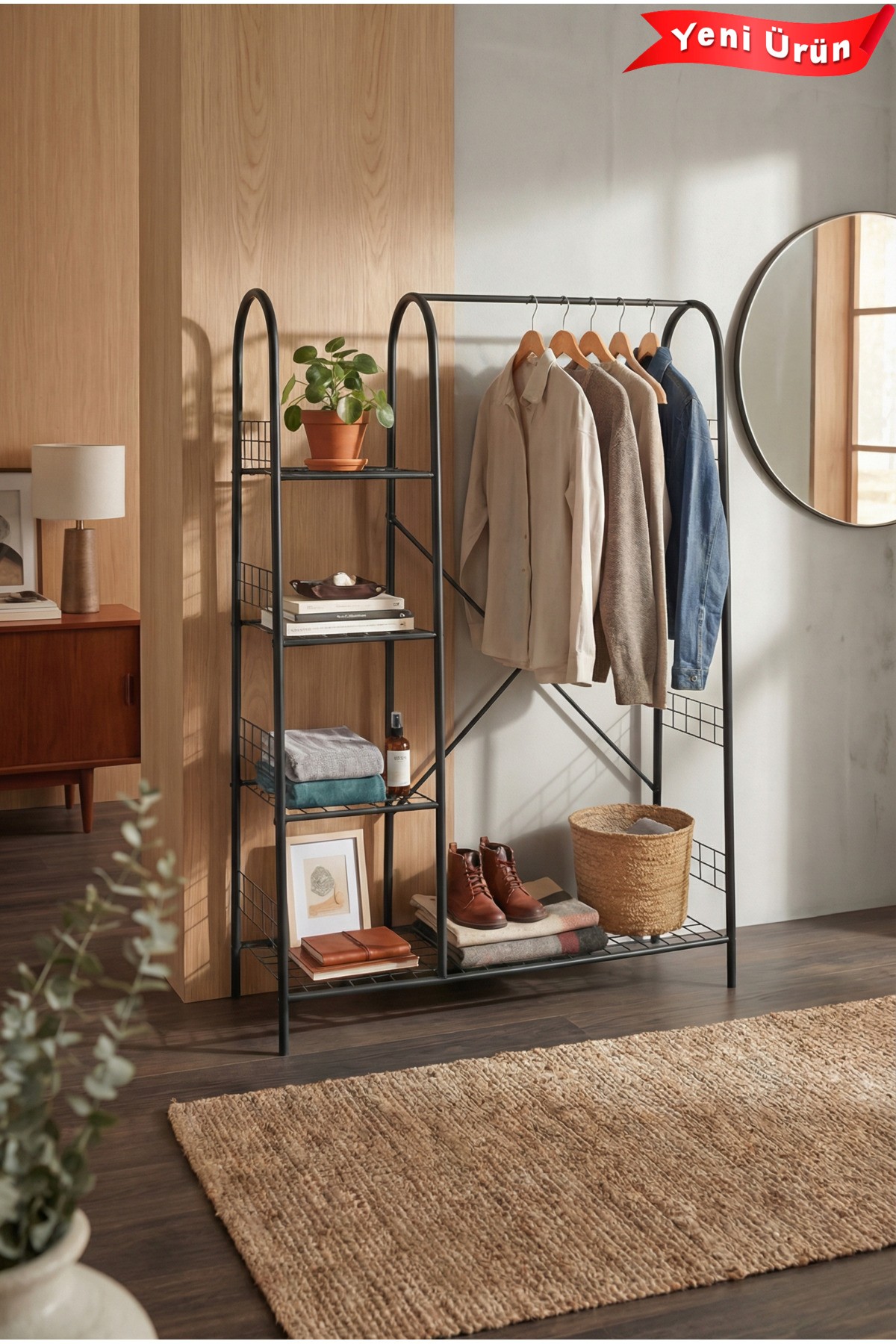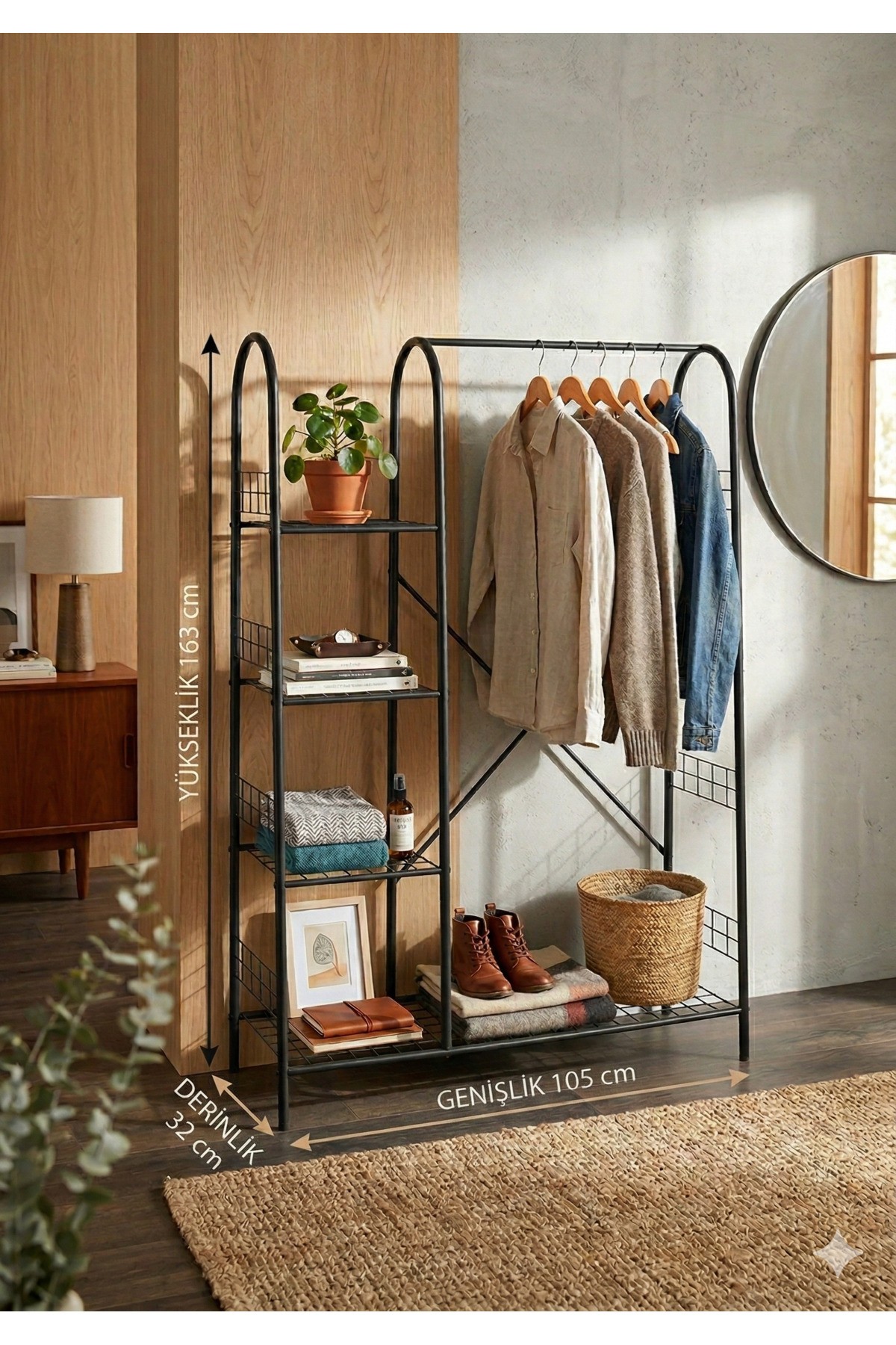 – Modern tasarımıyla evinizin dekorasyonuna şık bir dokunuş katar.; – 105 cm genişliğinde ve 163 cm yüksekliğindeki yapısı ile geniş depolama alanı sunar.; – Dayanıklı metal materyali sayesinde uzun ömürlü kullanım vaat eder.; – 5 raflı tasarımı ile kıyafetlerinizi düzenli bir şekilde asmanızı ve saklamanızı kolaylaştırır.; – Türkiye'de üretilmiş olup, yerel kaynaklı kaliteli bir üründür.; – Ayaklı askılık tipi, kolay montaj ve taşınabilirlik sağlar.;