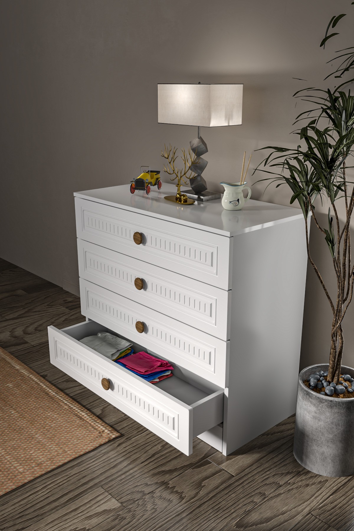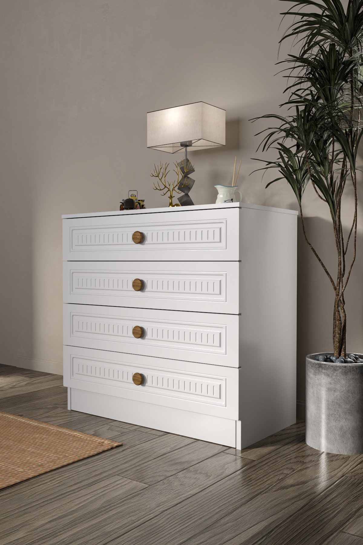 – Modern tasarımı ile her yatak odasına şıklık katan Bohem Şifonyer, günümüzün trendlerine uygun bir stil sunar.; – 4 adet geniş çekmece ile geniş saklama alanı sağlar, böylece kişisel eşyalarınızı düzenli bir şekilde saklayabilirsiniz.; – Suntalam malzemesi sayesinde dayanıklılık ve uzun ömürlü kullanım vaat eder.; – 84 cm yükseklik, 89 cm genişlik ve 44 cm derinlik ölçüleriyle ideal boyutlarda tasarlanmıştır; alanınızda maksimum verimlilik sağlar.; – Türkiye'de üretilmiş olmasıyla yerel üretimden gelen kaliteyi ve güvenilirliği temsil eder.;